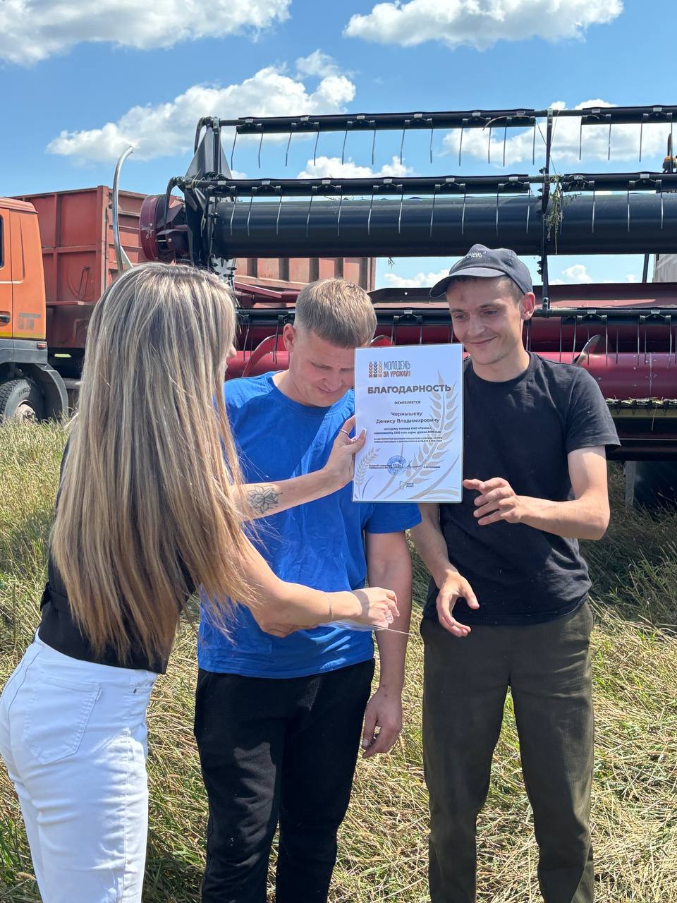 Первый секретарь районной организации Анастасия Ганчарик побывала в полях хозяйства и поздравила молодежные экипажи с высокими достижениями в уборочной кампании 2025